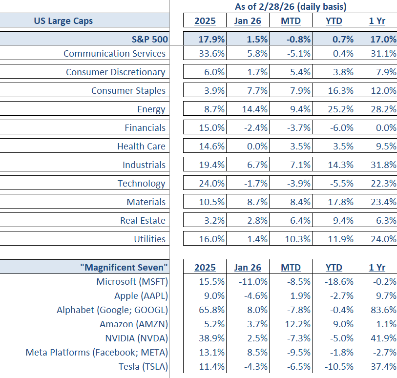 Year to date, the S&P 500 is up just 0.7%. That headline number hides a significant rotation. Leadership has shifted away from the high P/E Magnificent Seven and hyperscale technology stocks and into lower valuation sectors.