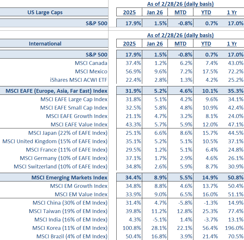 International markets continue to outperform the U.S. Developed international stocks are up over 10%, and emerging markets are up nearly 15%, led by very strong gains in South Korea and Taiwan.