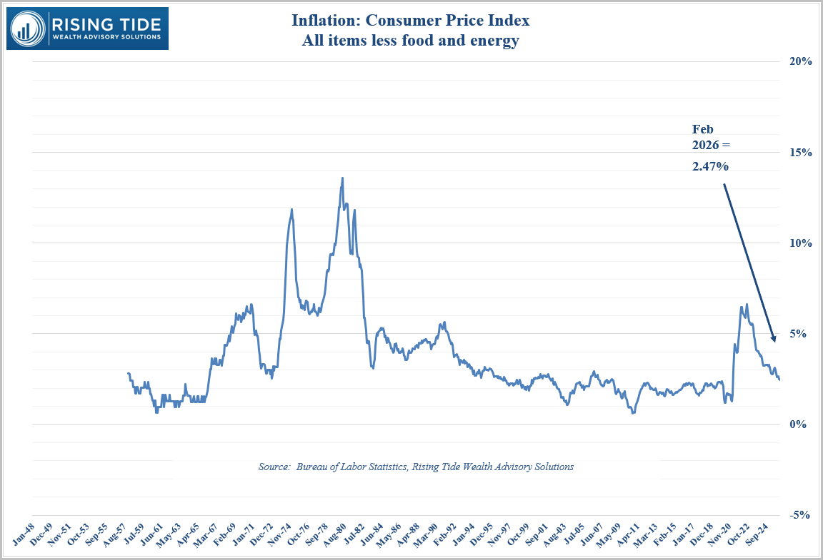 Inflation continues to trend in the right direction, though with new risks emerging. The February CPI report showed continued progress, but the recent spike in oil prices is likely to create upward pressure in the months ahead as energy costs feed into transportation, manufacturing, and ultimately consumer prices.