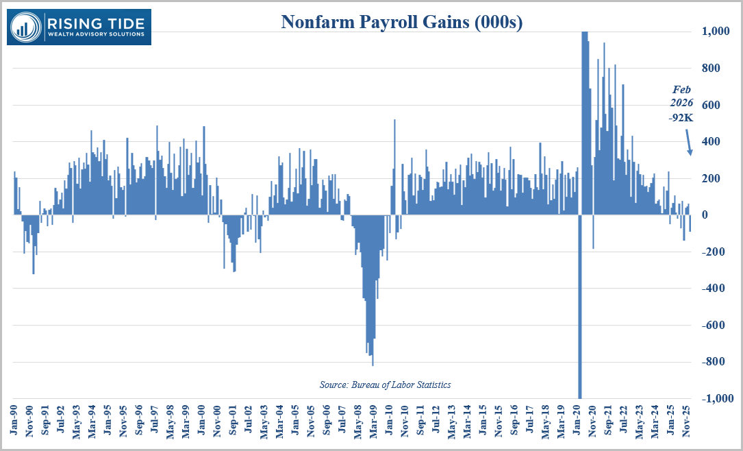 While markets have been volatile, the economic data paints a picture of a cooling economy. The labor market has clearly softened over the past year. February nonfarm payrolls declined by 92,000 jobs, marking the fifth negative reading in the past 14 months while the unemployment rate ticked higher to 4.4%. Losses were concentrated in leisure and hospitality, as well as healthcare. This suggests a labor market that is no longer robust, but not necessarily collapsing.