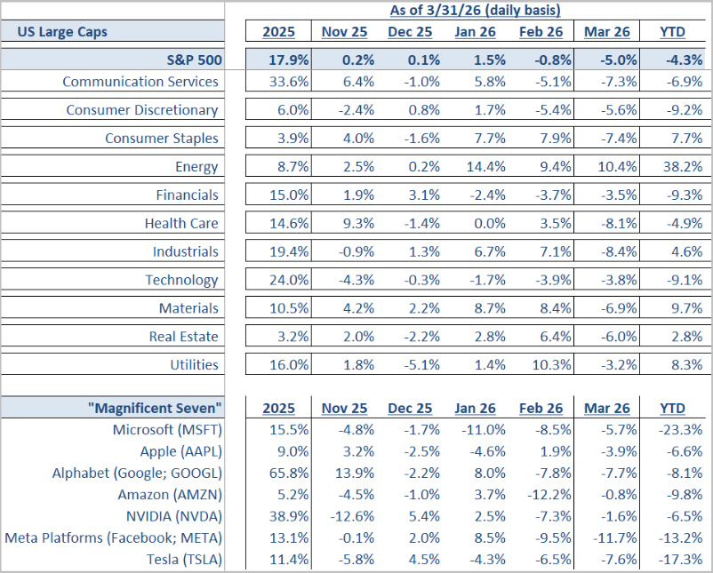 Energy was the clear standout. The sector rose 10.4% in March and is now up 38.2% for the year, driven by rising oil prices. Outside of energy, weakness was broad during the month. Healthcare and Industrials each fell more than 8% in March, and the Magnificent Seven extended their declines. Mid cap and small cap stocks offered little diversification benefit, with both segments down roughly 5% during the month.