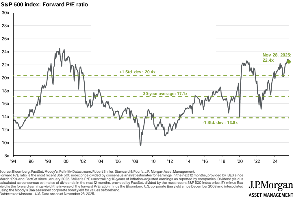 With the S&P 500 trading at roughly 22.4 times earnings, valuations are elevated but not unprecedented. The key for investors is managing concentration risk while still benefiting from innovation, which is exactly what diversified portfolios are designed to do.