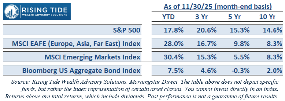 • The S&P 500 has delivered a gain of 17.8% including dividends this year, international stocks have outperformed US stocks for the first time in many years (+28.0% for Developed Markets and +30.4% for Emerging Markets), and bonds have returned 7.5% as interest rates stabilized.
