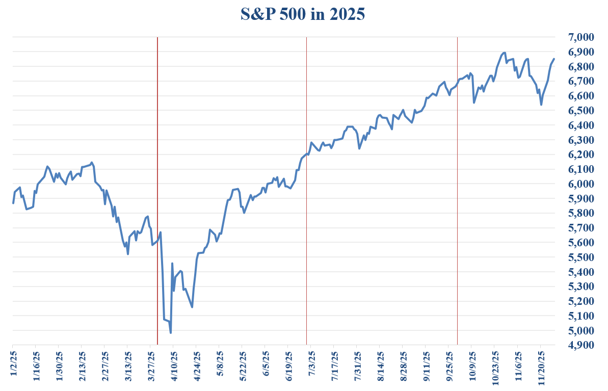 While most late November headlines centered on AI stocks, the recent pullback also reflected a broader collection of worries found in typical late-cycle periods. Expectations for another Fed rate cut in December diminished, creating some uncertainty around the path of monetary policy. Investors also worried about the stability of private credit markets, government funding deadlines, tariff announcements, and layoff headlines from large employers.