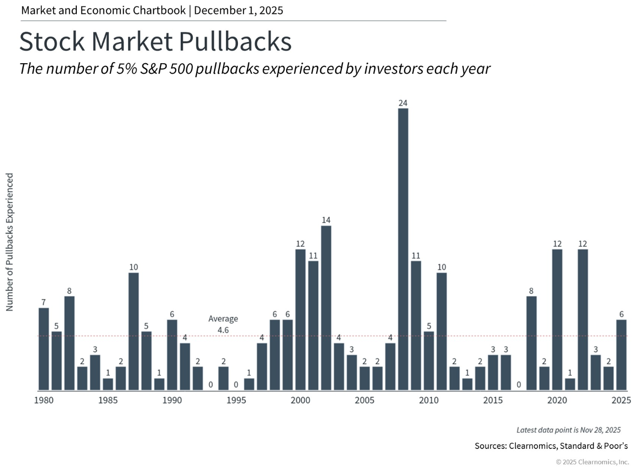 Still, none of these concerns represent new or unexpected threats. Pullbacks of 5% or more occur multiple times in most years, even when annual returns are positive, and this year’s decline fits that historical pattern exactly. After a strong multi-year run, some consolidation is not only normal but healthy.